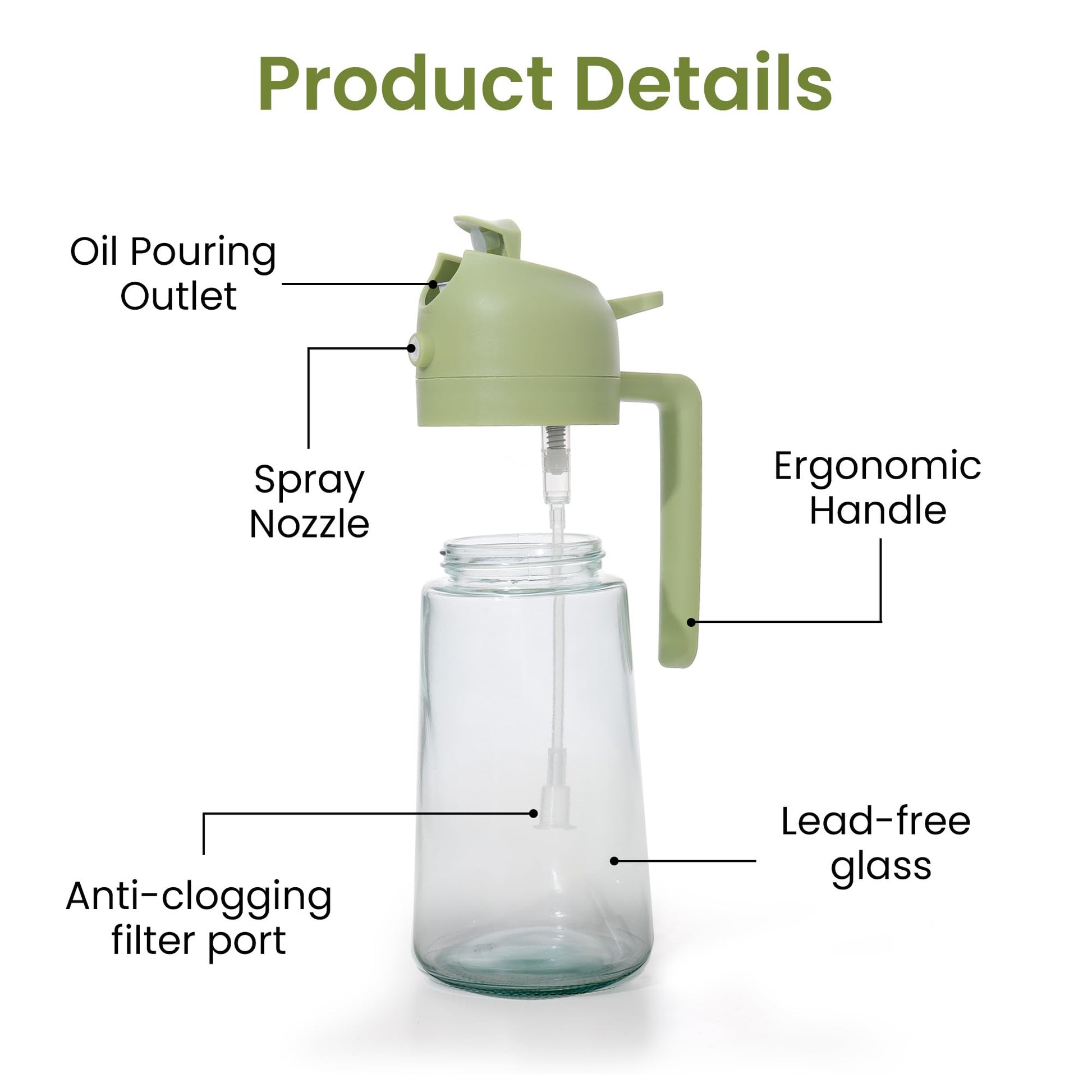 With its 2-in-1 functionality, you can spray oil evenly over salads, grills, and air-fried dishes or pour directly when cooking and seasoning. The bottle is crafted from durable glass with a secure leak-proof cap, ensuring no spills or mess.